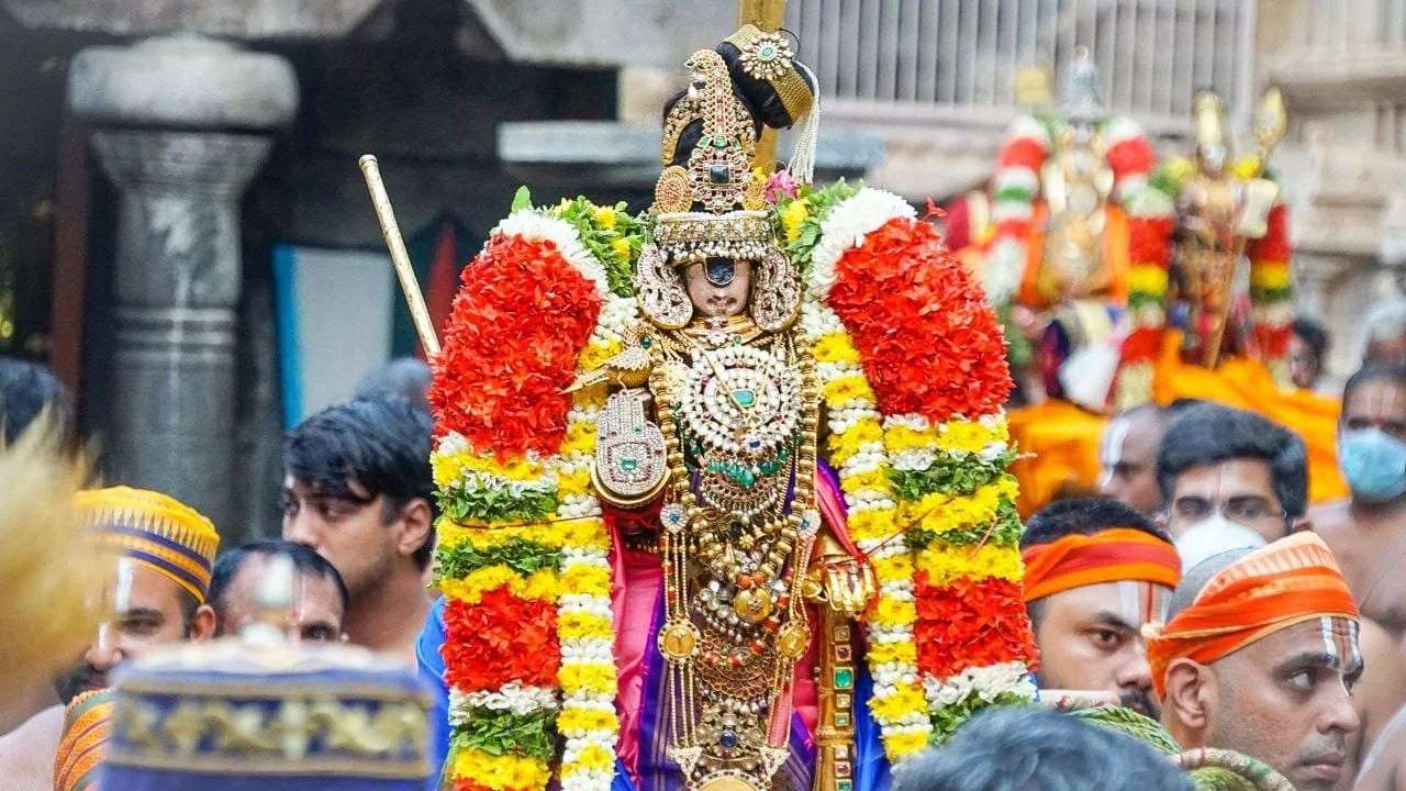 ஸ்ரீரங்கம் அருள்மிகு அரங்கநாதசுவாமி திருக்கோயில் : திருஅத்யயன உற்சவம், வைகுந்த ஏகாதசி பகல் பத்து 2- ம் நாள் (05.12.2021) ஸ்ரீ நம்பெருமாள் சவுரிக் கொண்டை , வைர அபயஹஸ்தம் , வைரகாதுகாப்பு ,தங்க கிளி, நெல்லிக்காய் மாலை , பவள மாலை ,தங்க பஞ்ஜாயுத மாலை , பருத்திக்காய் காப்பு அலங்காரத்தில் பக்தர்களுக்கு சேவை சாதித்தார்